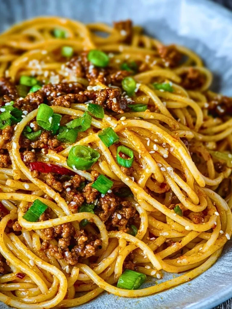 Imagine tender spaghetti tangled in a rich, soy-based sauce, speckled with juicy ground beef, fresh garlic, ginger, chili flakes, and scallions. It’s spicy, saucy, and ready in under 30 minutes. Perfect for weeknight dinners, lazy lunches, or even a flavorful meal prep option.
