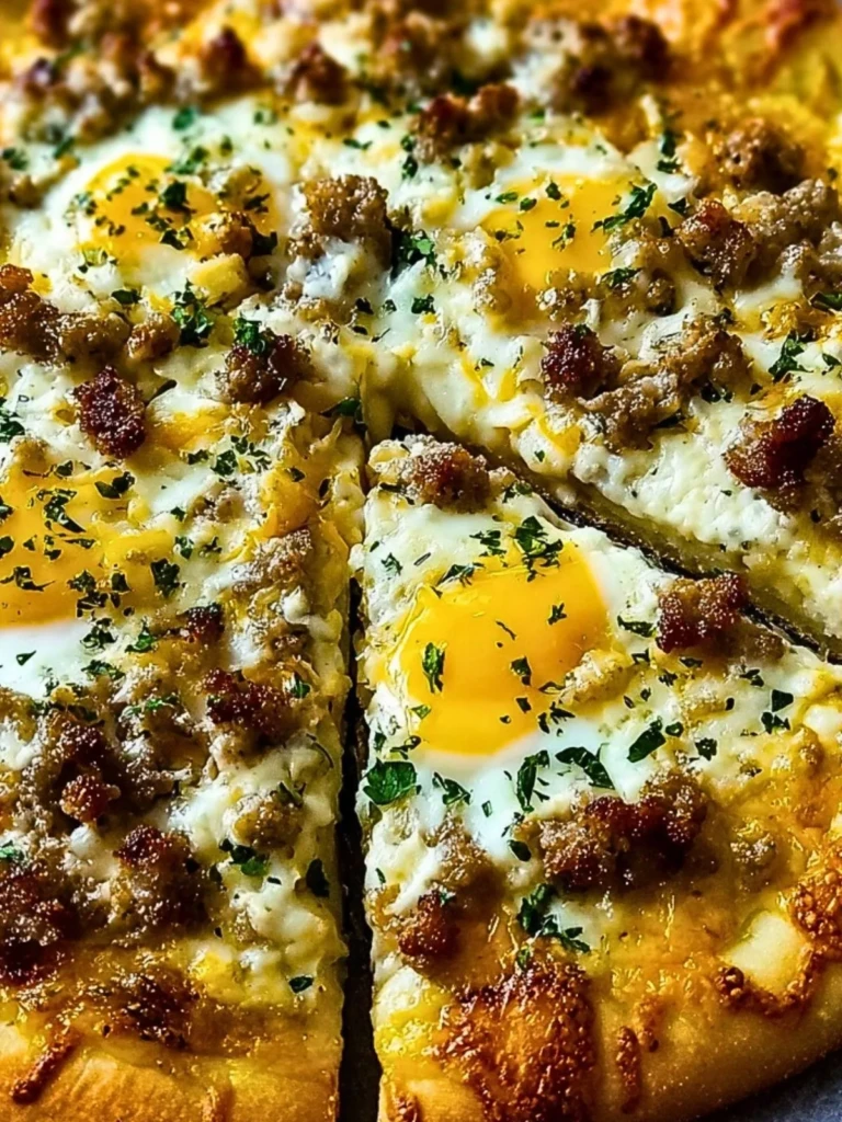 This pizza combines everything good about breakfast into one dish: rich, creamy sausage gravy as the base, a golden biscuit crust for the foundation, savory breakfast sausage crumbles, and eggs cooked right on top. It’s a one-pan wonder that feeds a group and feels like a special occasion meal without all the effort.