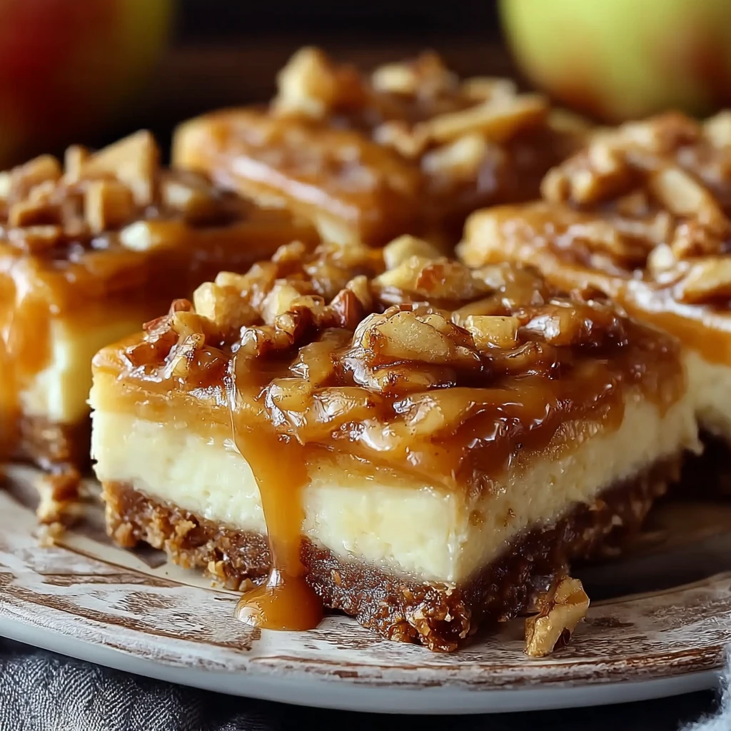 Caramel Apple Cheesecake Bars combine everything you love about fall desserts into one irresistible bite. A buttery graham cracker crust supports a creamy vanilla cheesecake layer, topped with tender cinnamon apples and finished with a glossy caramel drizzle and crunchy pecans. Every slice delivers sweet, tangy, spiced, and buttery notes in perfect balance.