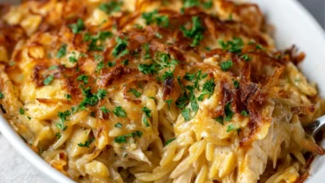 French Onion Chicken Orzo Casserole