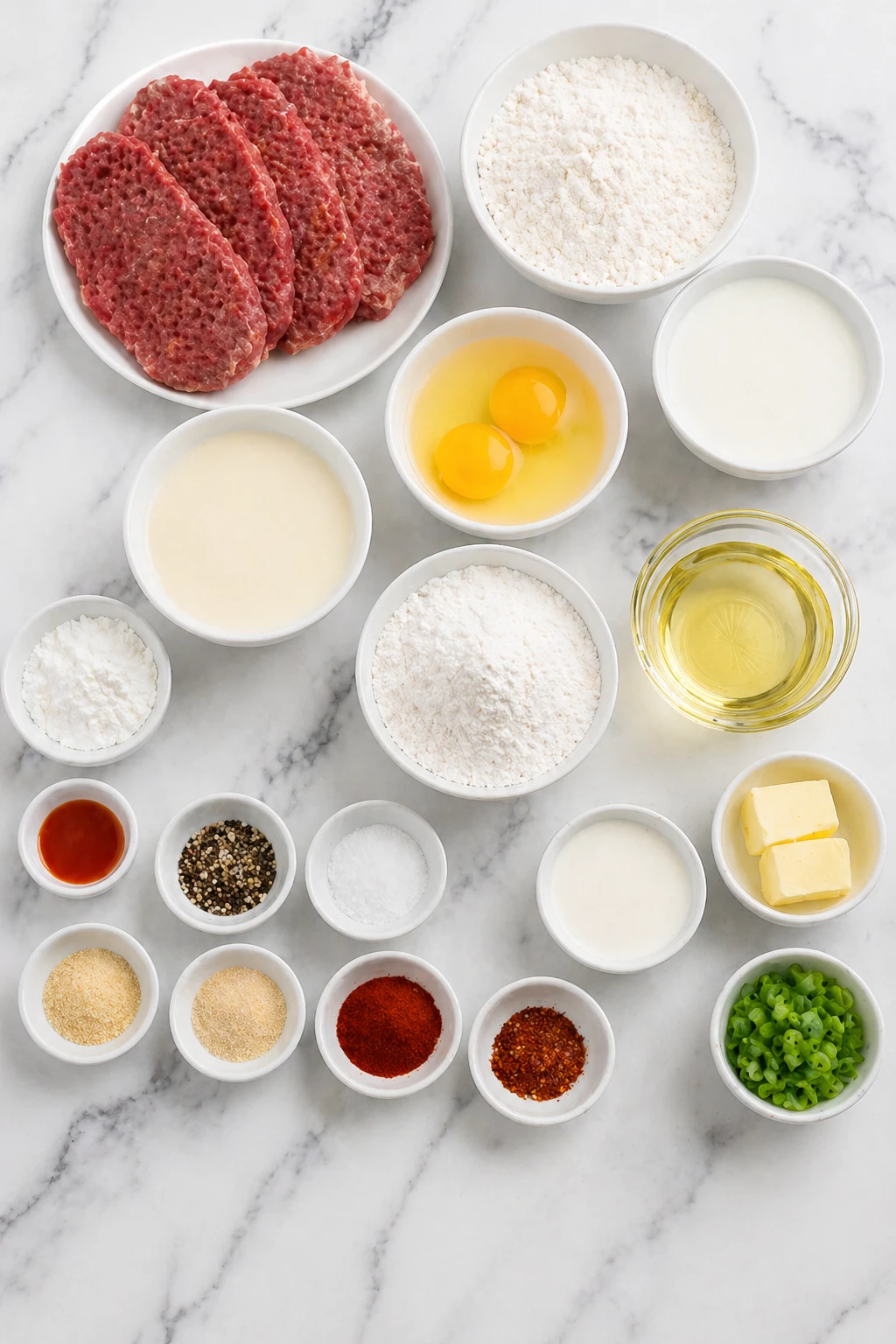 These ingredients are simple, but each one has a job. The steak needs seasoning from the inside out, the coating needs structure and crunch, and the gravy needs enough richness and pepper to taste like true comfort food.