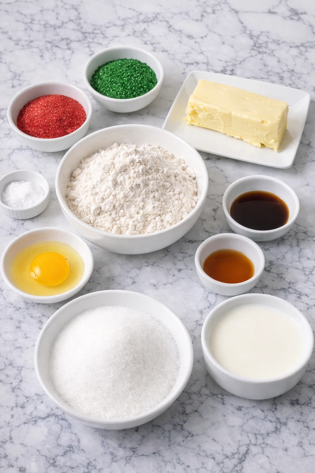 For flavor, these cookies lean on vanilla extract with a hint of almond extract. The almond doesn’t make the cookies taste like almond candy; it simply boosts that classic bakery-style sugar cookie flavor. A generous sprinkle of red and green sanding sugar adds sparkle, subtle crunch, and instant Christmas cheer.