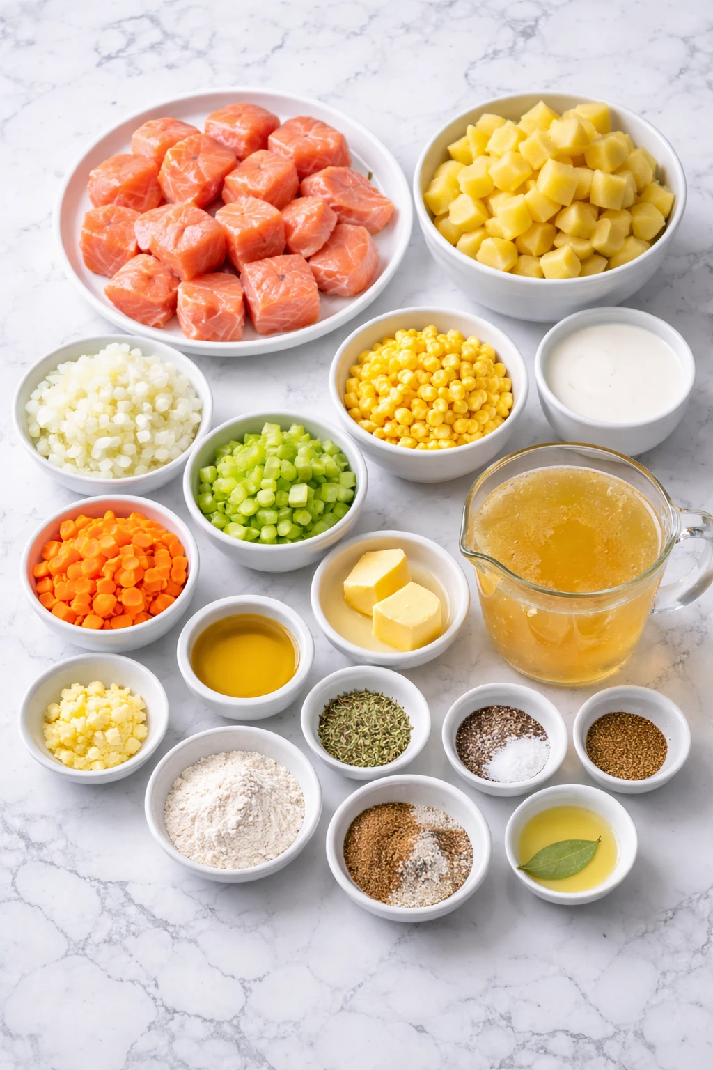 - Salmon fillets – The star of the chowder, adding rich flavor, flaky texture, and plenty of protein.
