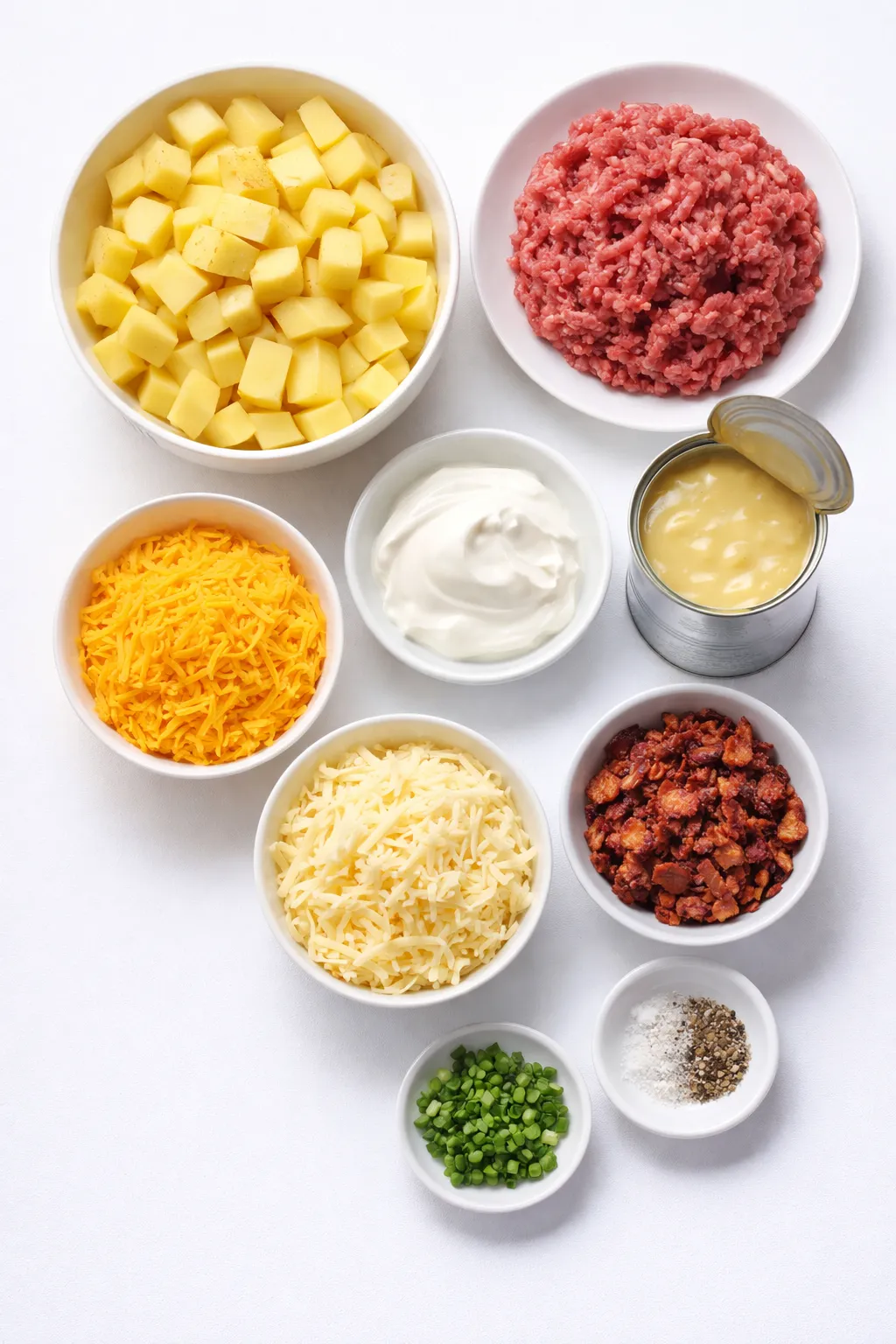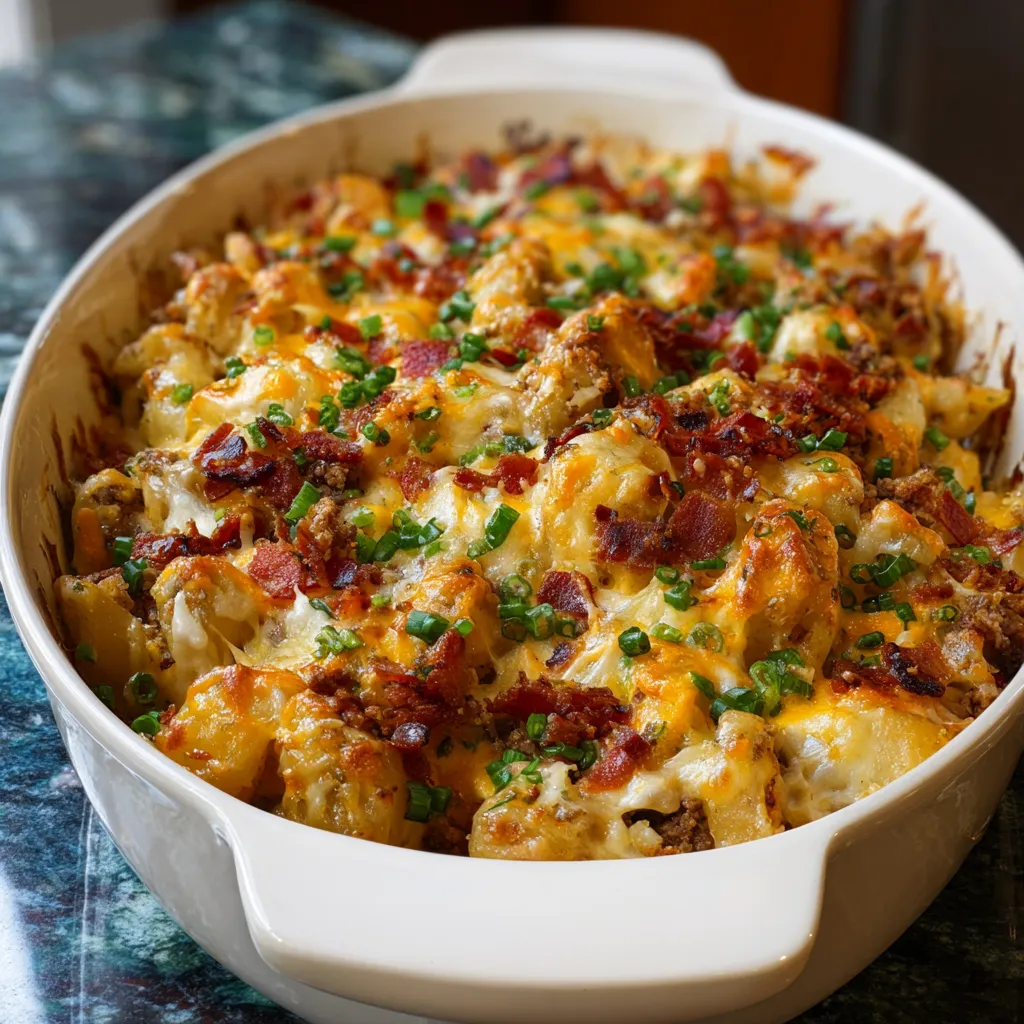 Golden roasted potatoes form the base, layered with seasoned ground beef, crispy bacon, and a blend of gooey cheddar and Monterey Jack cheese. A touch of sour cream and cream of chicken soup brings it all together into one bubbling, crave-worthy bake.