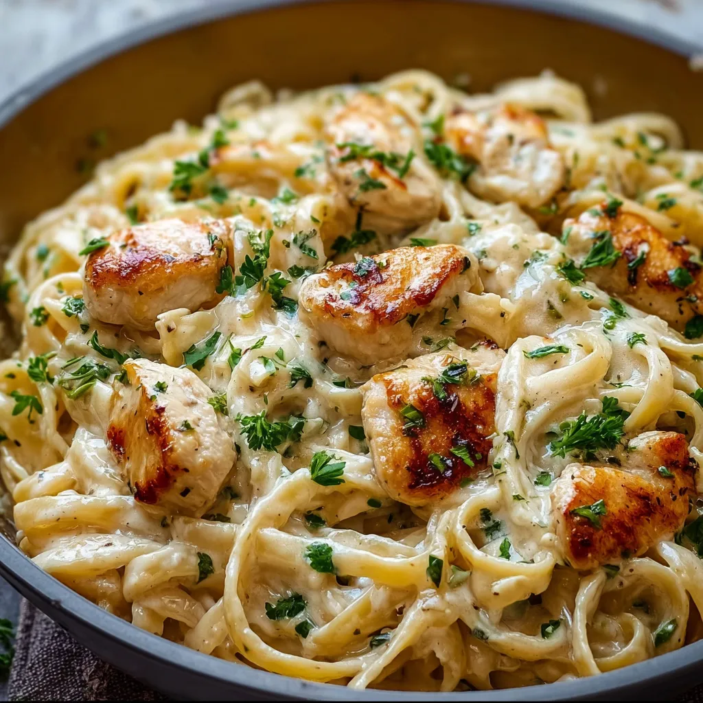 The creaminess of the sauce, balanced by the sharpness of Parmesan and the warmth of garlic, wraps each bite in a cozy, savory hug. Paired with golden chicken pieces and a sprinkle of fresh parsley, this pasta promises to satisfy cravings and become a repeat favorite.