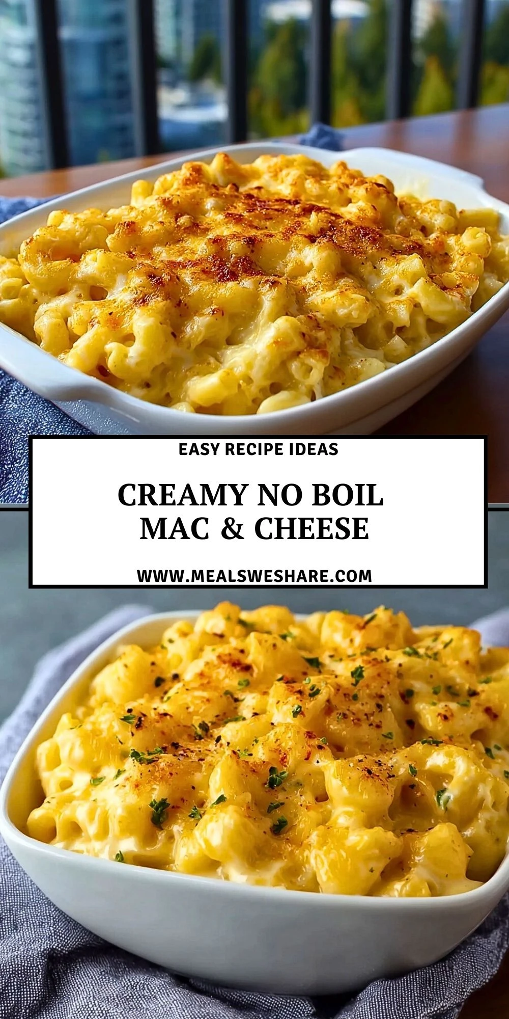 Keywords: creamy no boil mac and cheese, baked mac and cheese, easy dinner idea, quick dinner, comfort food, cheesy pasta bake, no boil pasta recipe