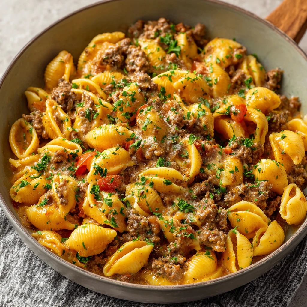 The best part is how the shells catch the creamy beef sauce in every little pocket. It tastes like a cross between a homemade cheeseburger pasta, a comforting beefy mac, and a weeknight pasta dinner that did not ask you to wash three pans afterward.