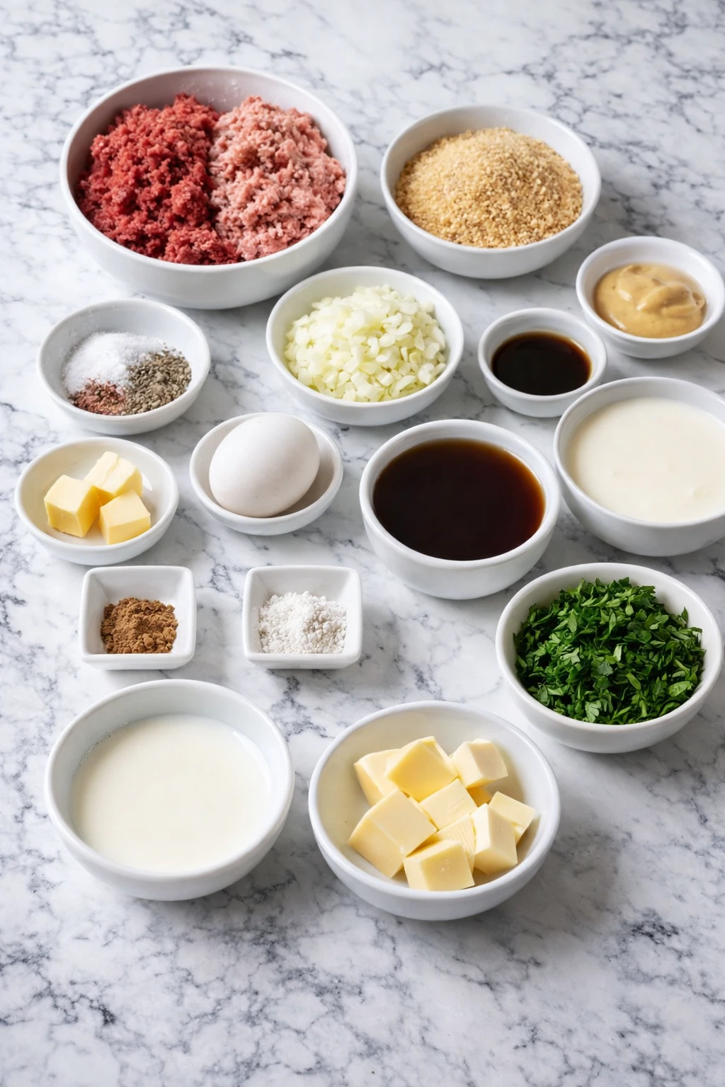 In a large bowl, combine the breadcrumbs and milk first so the crumbs can soften. Add the ground beef, ground pork, egg, finely chopped onion, garlic, salt, black pepper, allspice, and nutmeg. Mix gently until everything is evenly combined, being careful not to overwork the meat.