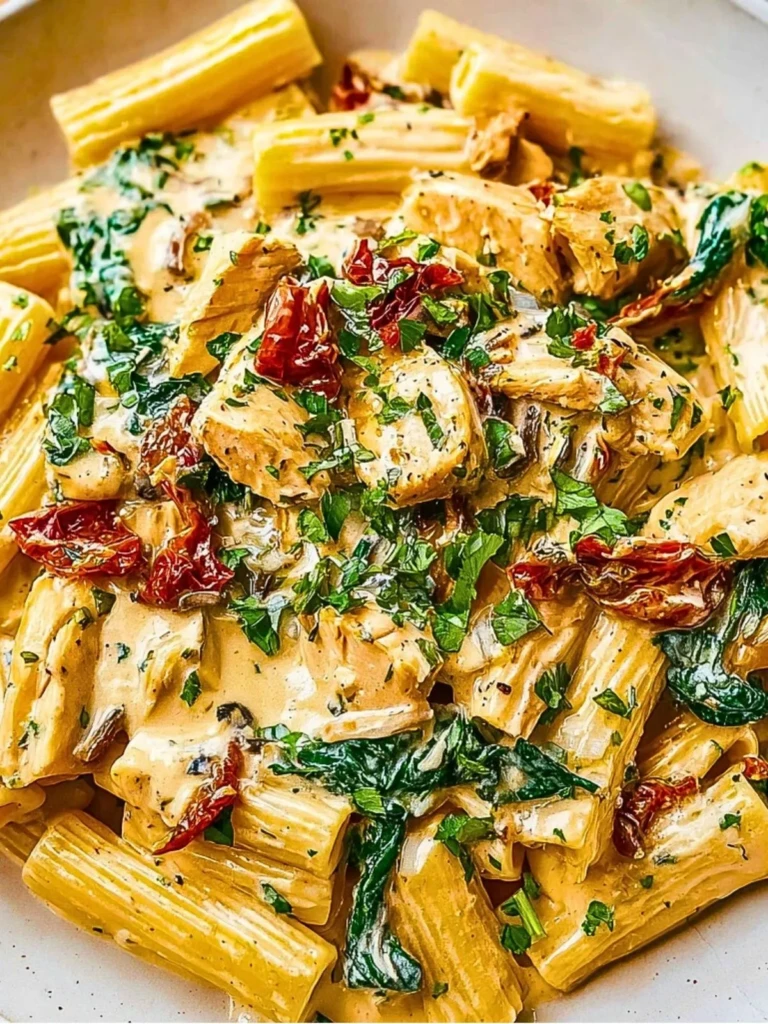 Looking for an easy dinner idea that’s packed with flavor? This Creamy Tuscan Chicken Pasta is a quick dinner recipe that combines juicy chicken, al dente rigatoni, and a rich garlic-Parmesan cream sauce with sun-dried tomatoes and spinach. Perfect for family meals, date nights, or comfort food cravings, this dish delivers both elegance and heartiness. Whether you’re after a cozy weeknight dinner or an impressive dish for guests, it’s one of the best creamy pasta food ideas to keep in rotation.