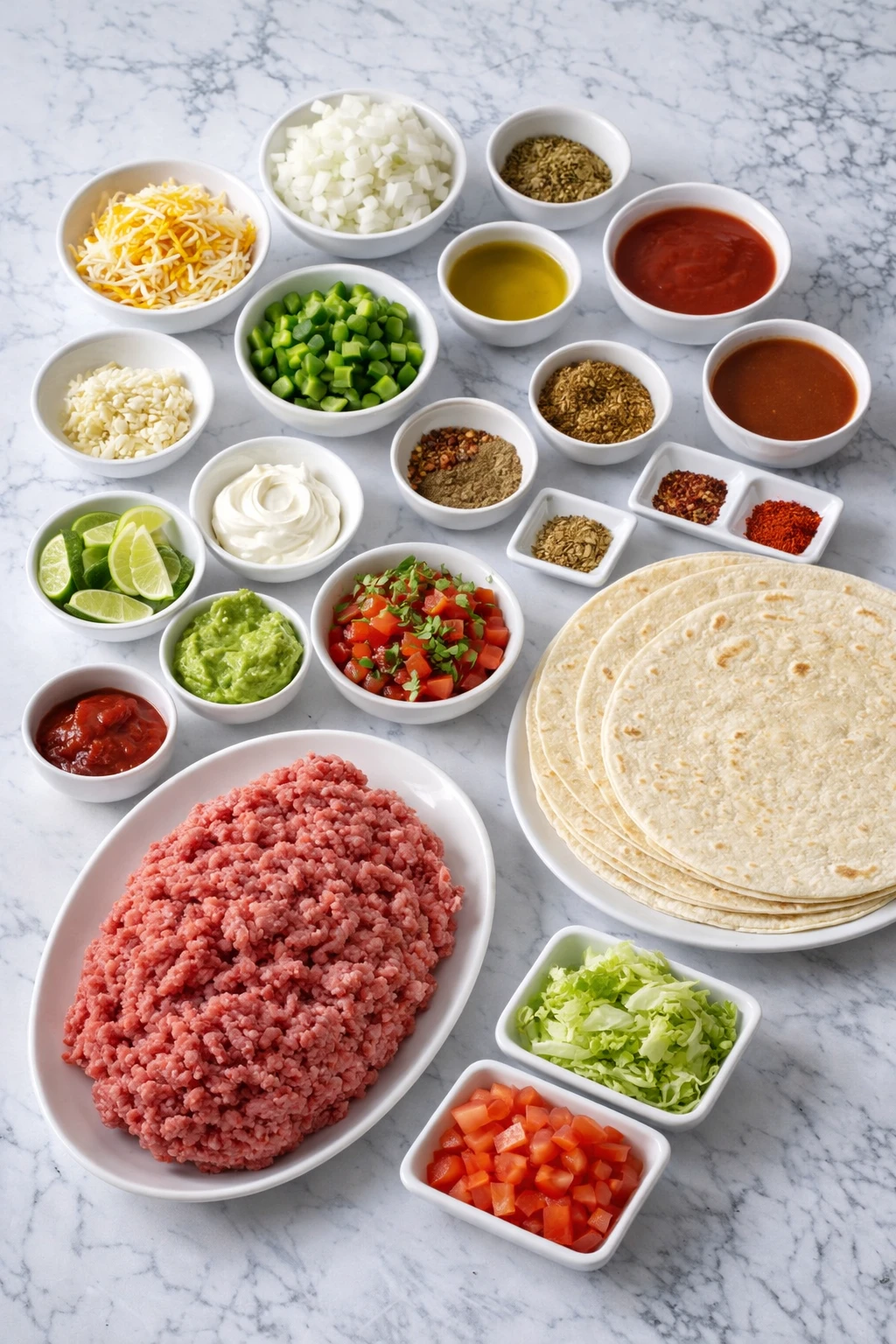 Toppings (lettuce, tomatoes, onion, cilantro, sour cream, guacamole, salsa, lime wedges) – Fresh toppings add crunch, creaminess, brightness, and a pop of acidity that balances the rich, cheesy beef.