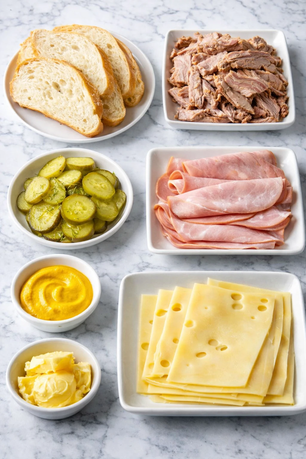 The magic comes from balance. The roast pork brings depth, the ham adds smoky savoriness, the Swiss cheese melts into every layer, and the pickles cut through the richness with a bright, briny bite. Mustard ties the whole sandwich together and the pressed bread creates that signature crunch.