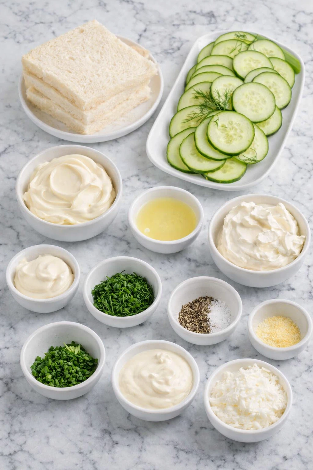 These cucumber tea sandwiches are made with a handful of simple ingredients that work together to create layers of cool, creamy, and herby flavor. Because there are so few elements, choosing good-quality ingredients makes a noticeable difference.