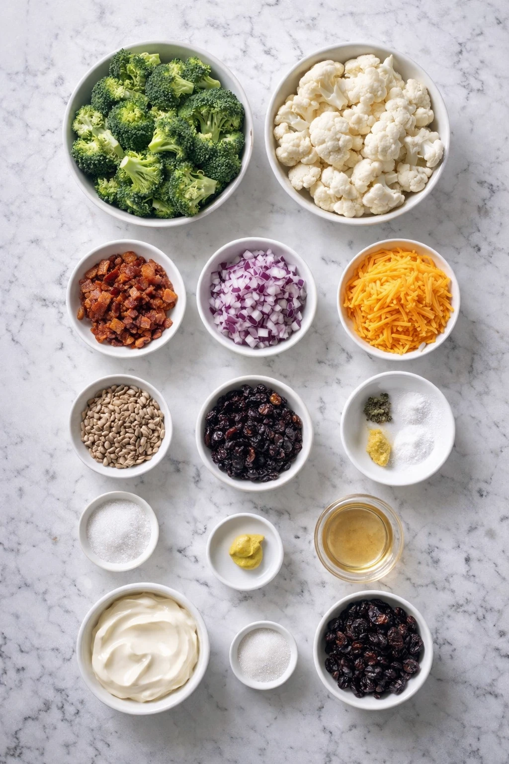 Rinse the broccoli and cauliflower thoroughly, then pat them dry with a clean towel. Cut them into small, bite-size florets so they’re easy to eat with a fork and each piece gets coated in dressing. Finely dice the red onion so it blends into the salad without overpowering the other flavors.