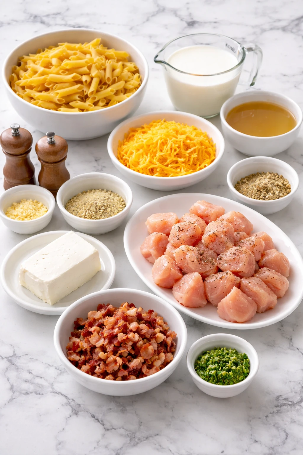 The magic of Easy Crack Chicken Pasta comes from the way a few bold ingredients work together. Cream cheese creates the rich base, cheddar adds sharp cheesy flavor, ranch seasoning brings an herby tang, and bacon adds a salty crunch that cuts through the creaminess.