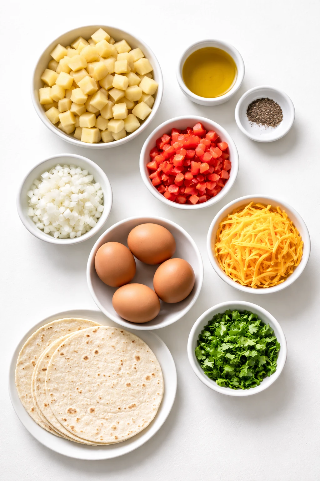 Ingredients for the Easy Potato, Egg, and Cheese Breakfast Tacos