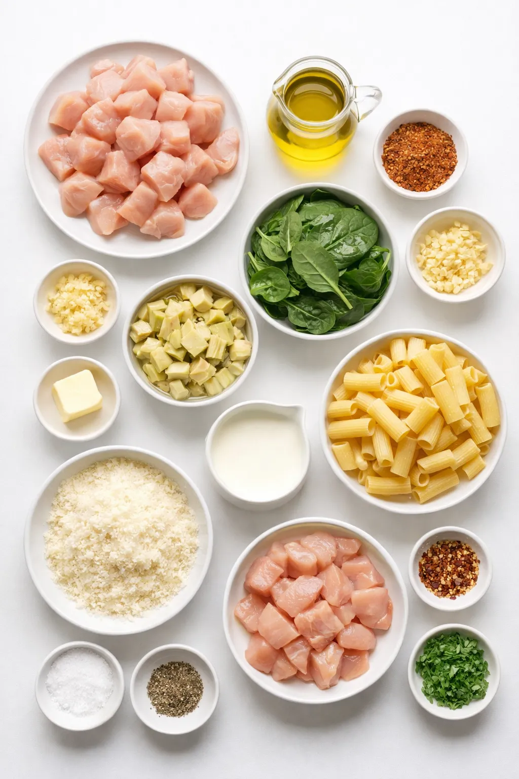 Ingredients for the Garlic Chicken Bites and Creamy Cajun Spinach Artichoke Alfredo Pasta