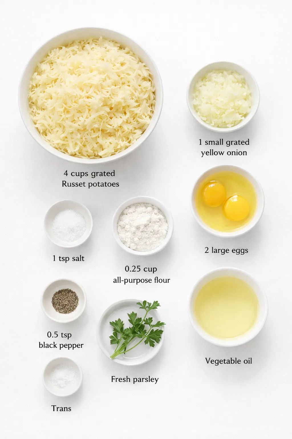 - 4 cups grated Russet potatoes: The base of the pancakes; high starch content yields that signature crisp.