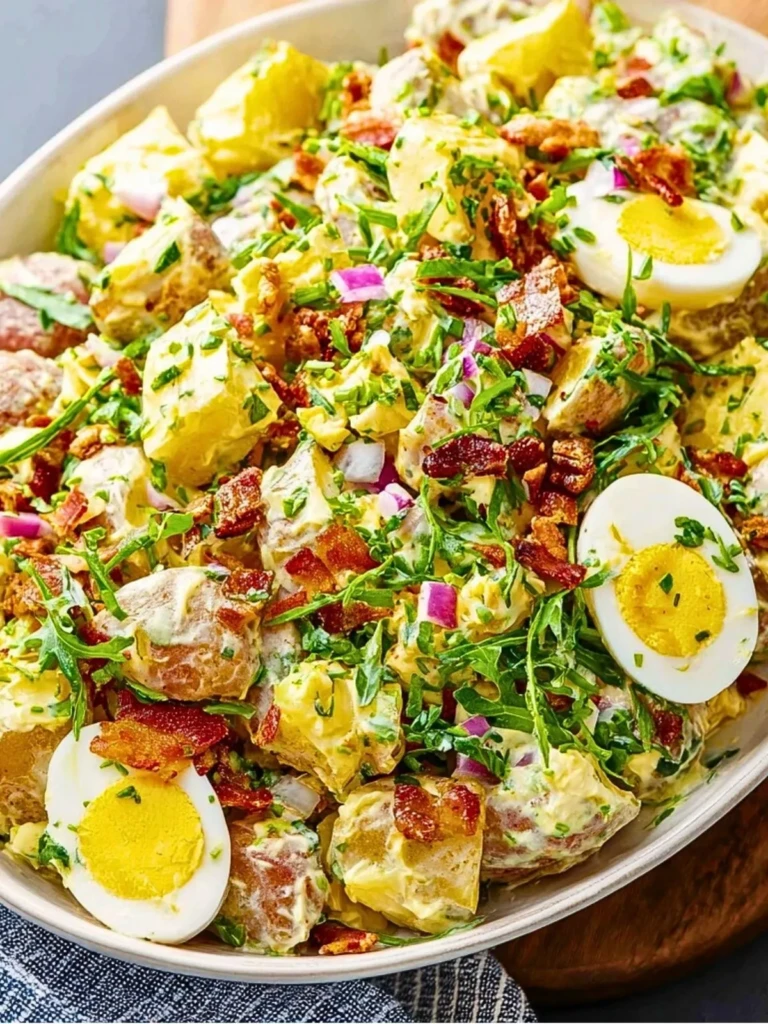 What makes this potato salad so irresistible is the balance of textures and flavors. The creaminess of the mayo and sour cream dressing contrasts beautifully with the crunch of bacon and the subtle bite of red onions. Toss in tender baby potatoes and fresh herbs, and you’ve got a dish that feels both comforting and elevated.