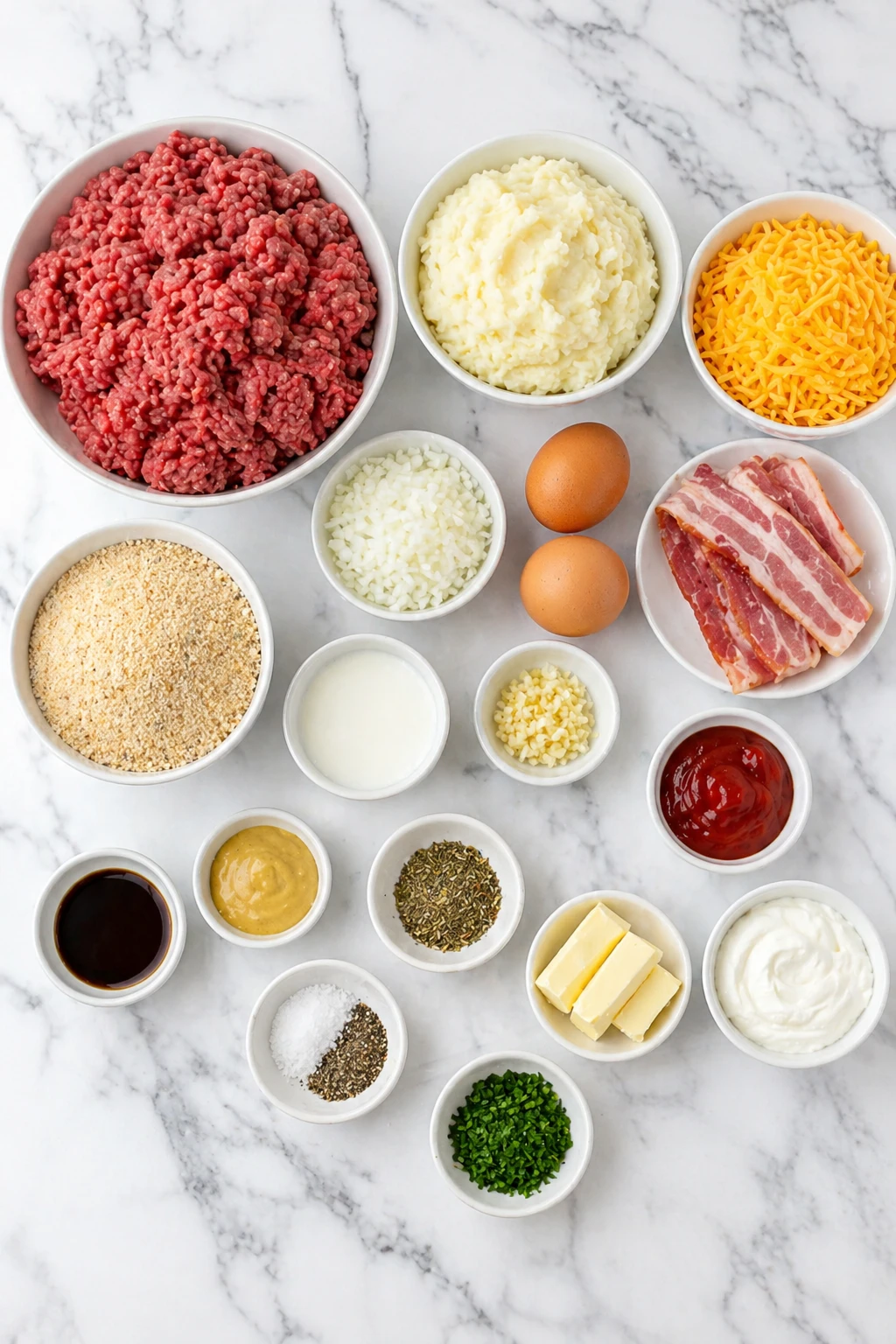 These ingredients build flavor in layers, from the seasoned meatloaf base to the creamy potato topping and golden cheese finish. Each one has a purpose, so the final dish comes out tender, rich, and easy to slice.