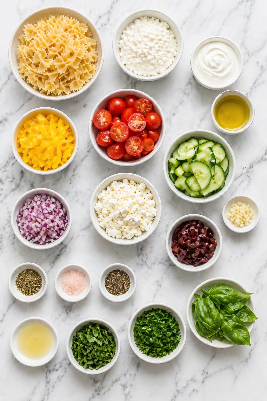 Ingredients for the Mediterranean Cottage Cheese Pasta Salad
