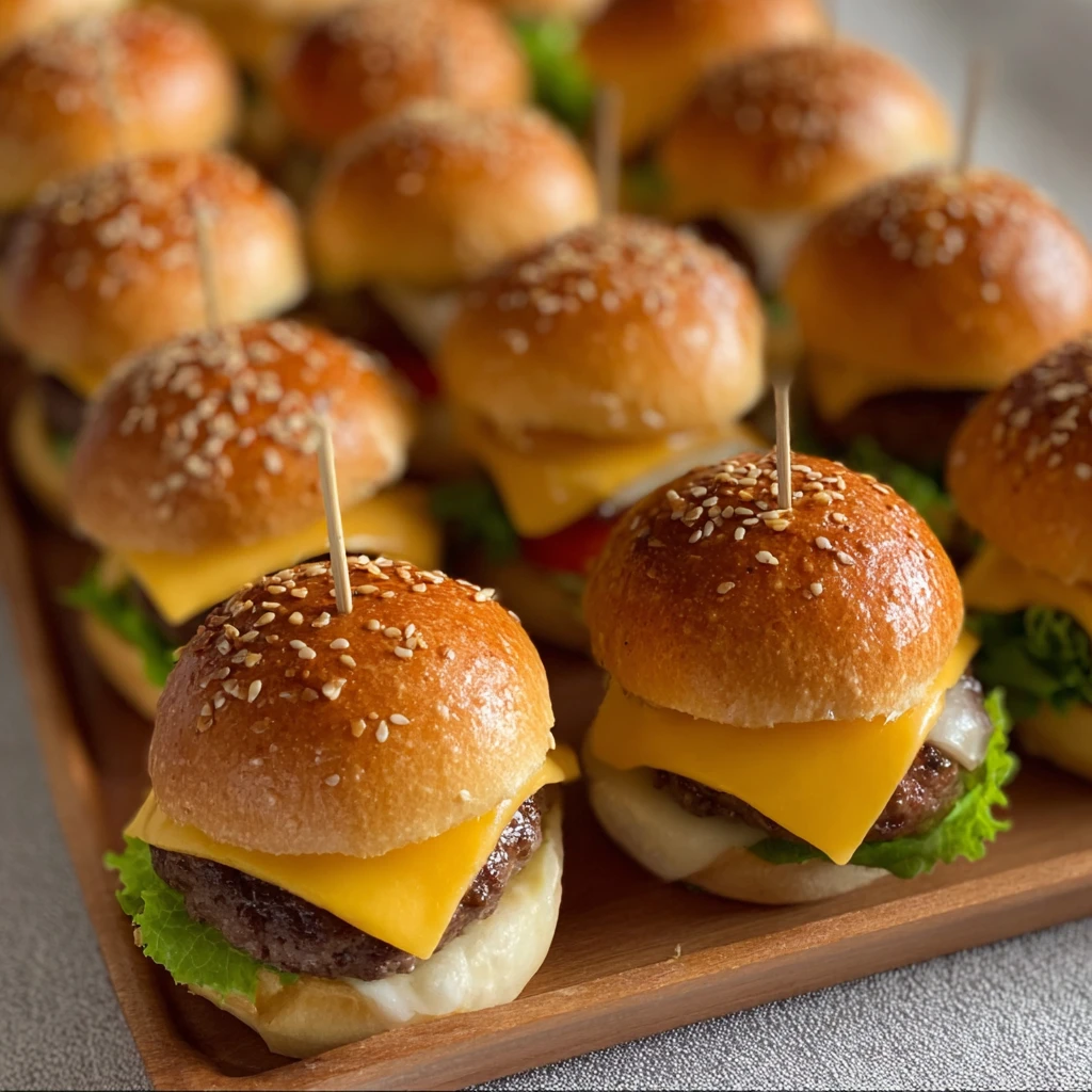 Bite-sized and bursting with flavor, Mini Cheeseburgers are the ultimate party food. Whether you’re serving them for game day, a birthday party, or as a family-friendly dinner, these sliders deliver all the juicy, cheesy satisfaction of a classic burger in an irresistibly cute package. Each mini burger is loaded with a tender beef patty, gooey cheddar cheese, crisp lettuce, and a pillowy, sesame-studded bun—making them a hit with guests of all ages.