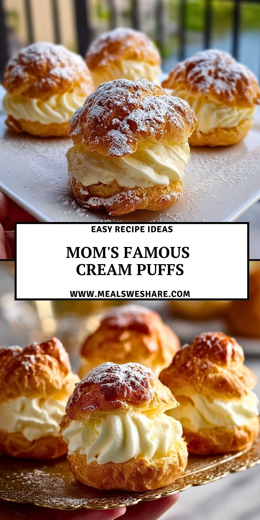 Keywords: Mom’s Famous Cream Puffs, cream puffs, easy dessert, homemade cream puffs, choux pastry, vanilla cream filling, party dessert, holiday dessert