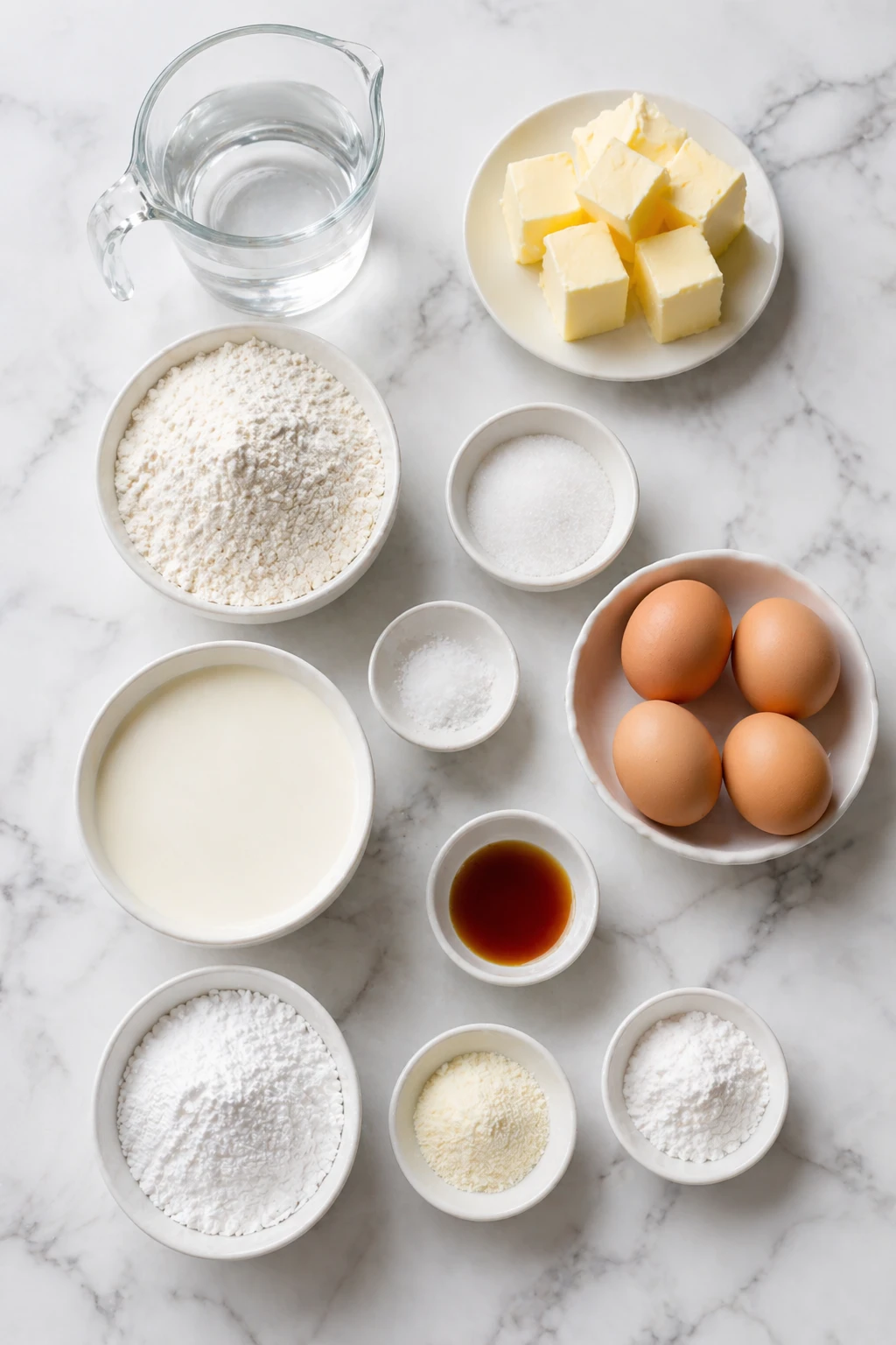 This recipe uses everyday baking staples, but each one has a clear job. The pastry needs structure, steam, and richness, while the filling needs enough body to pipe beautifully and stay fluffy inside the shells.