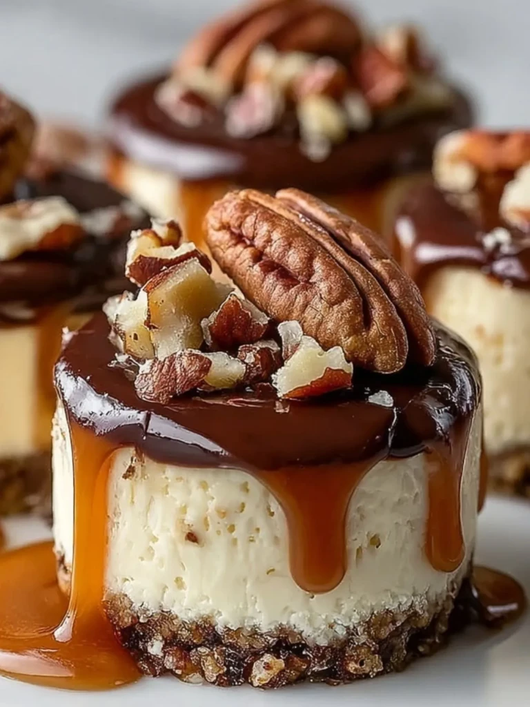 Keywords: no bake cheesecake, turtle dessert, mini cheesecake, caramel chocolate pecan