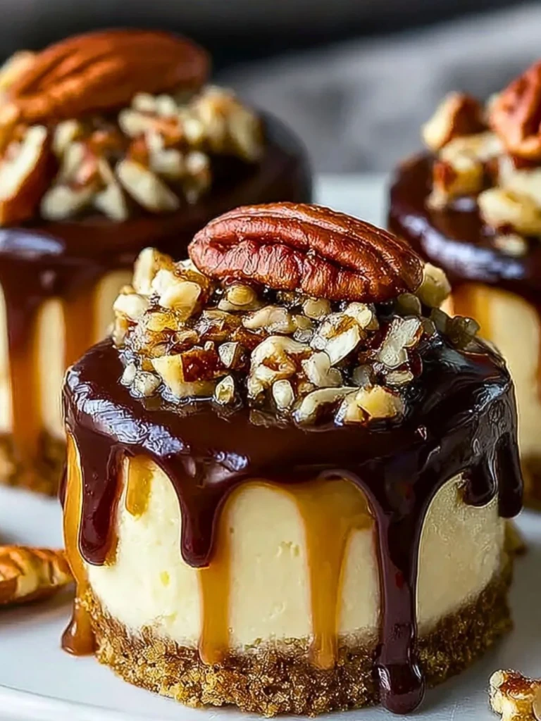 Drizzle caramel sauce generously over the ganache, then top each mini cheesecake with chopped pecans and a few whole ones for a beautiful finish.