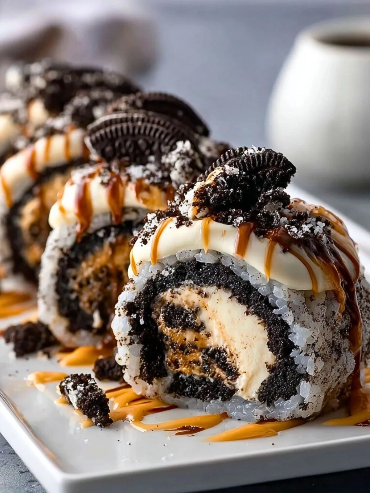 Imagine your favorite cookies and cream flavor reimagined into a silky, sliceable roll, coated in Oreo crumbs and topped with whipped cream and more cookies. The creamy filling contrasts beautifully with the chocolatey outer layer, and the hidden caramel adds a gooey surprise. These Oreo Sushi Rolls not only satisfy your sweet tooth but also bring smiles with every bite.