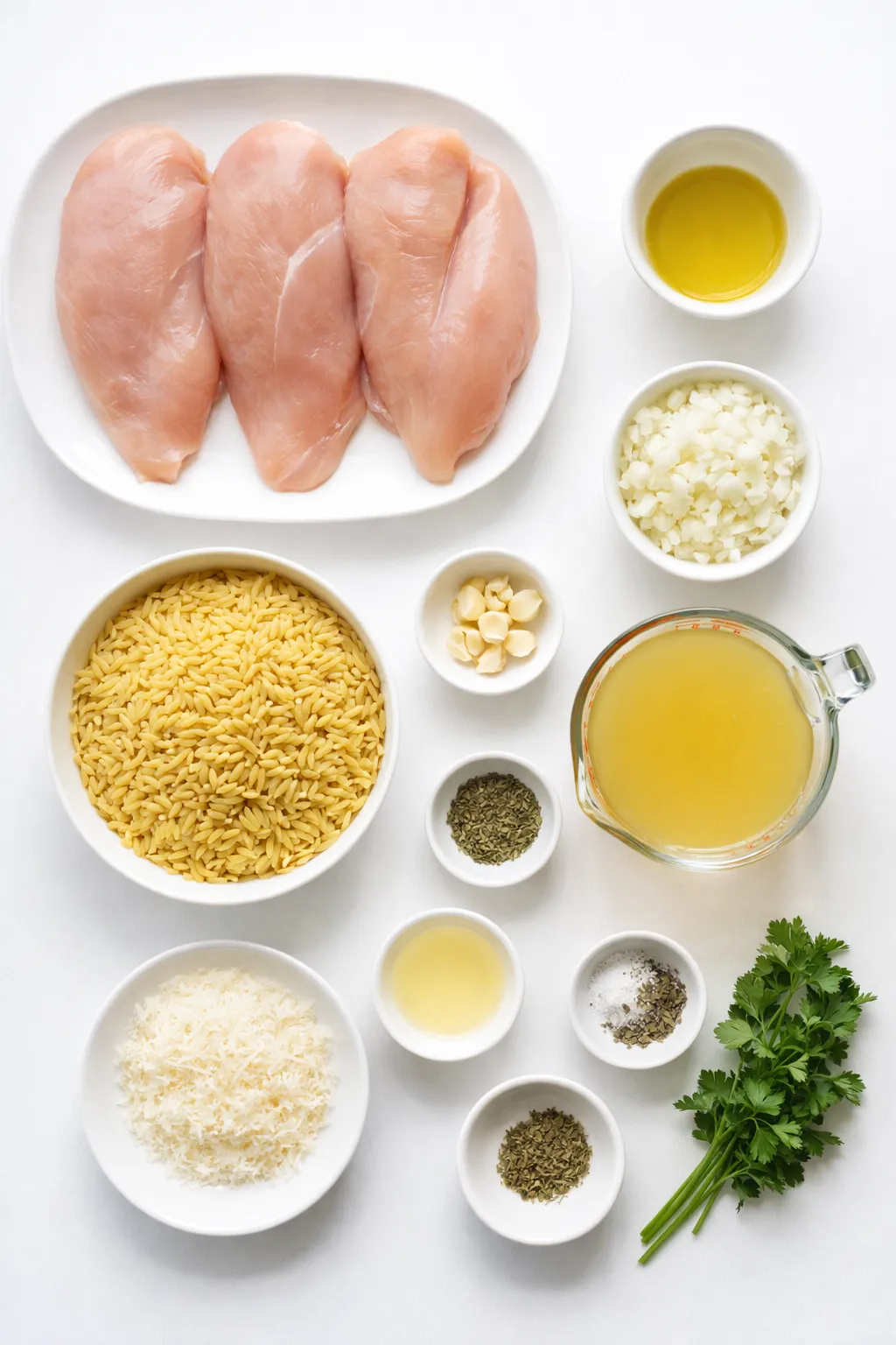 Nestle the cooked chicken back into the orzo and heat everything through for 2–3 minutes. Garnish with fresh parsley and additional parmesan before serving.