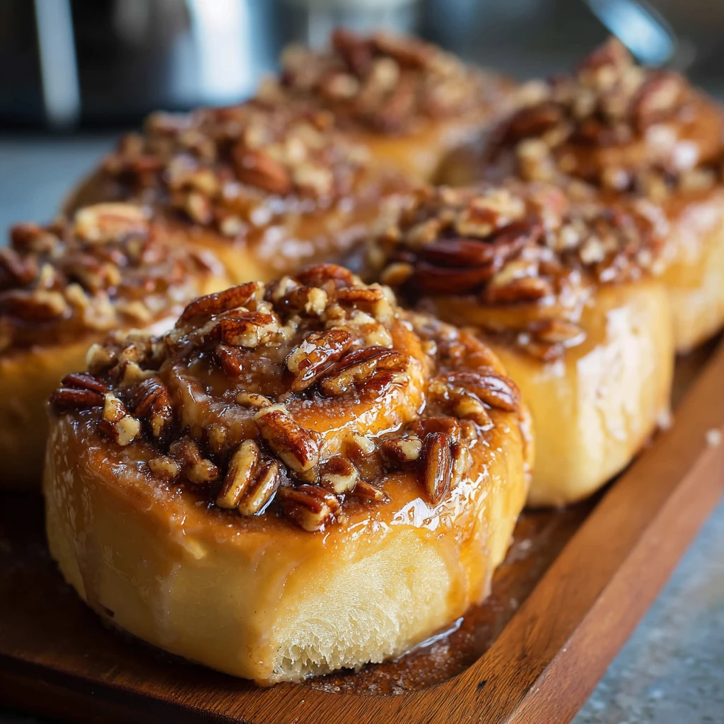 Let the rolls cool for a few minutes, then carefully turn them out so the pecan topping ends up on top. Serve them warm while the sticky glaze is still glossy and soft.