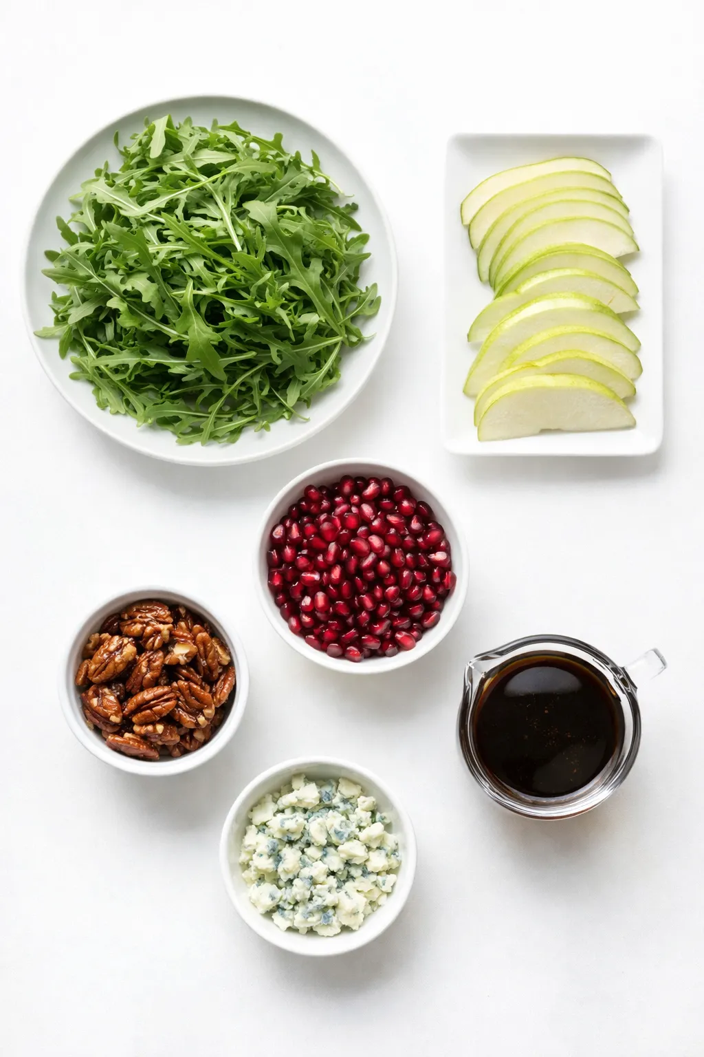 Yes! Prepare the components up to a day ahead. Store the arugula, sliced pears (tossed with lemon to prevent browning), pomegranate seeds, candied pecans, and cheese separately. Assemble just before serving.