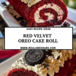 Keywords: red velvet oreo cake roll, oreo dessert roll, cake roll with cream cheese, easy dessert recipe, rolled cake, party dessert