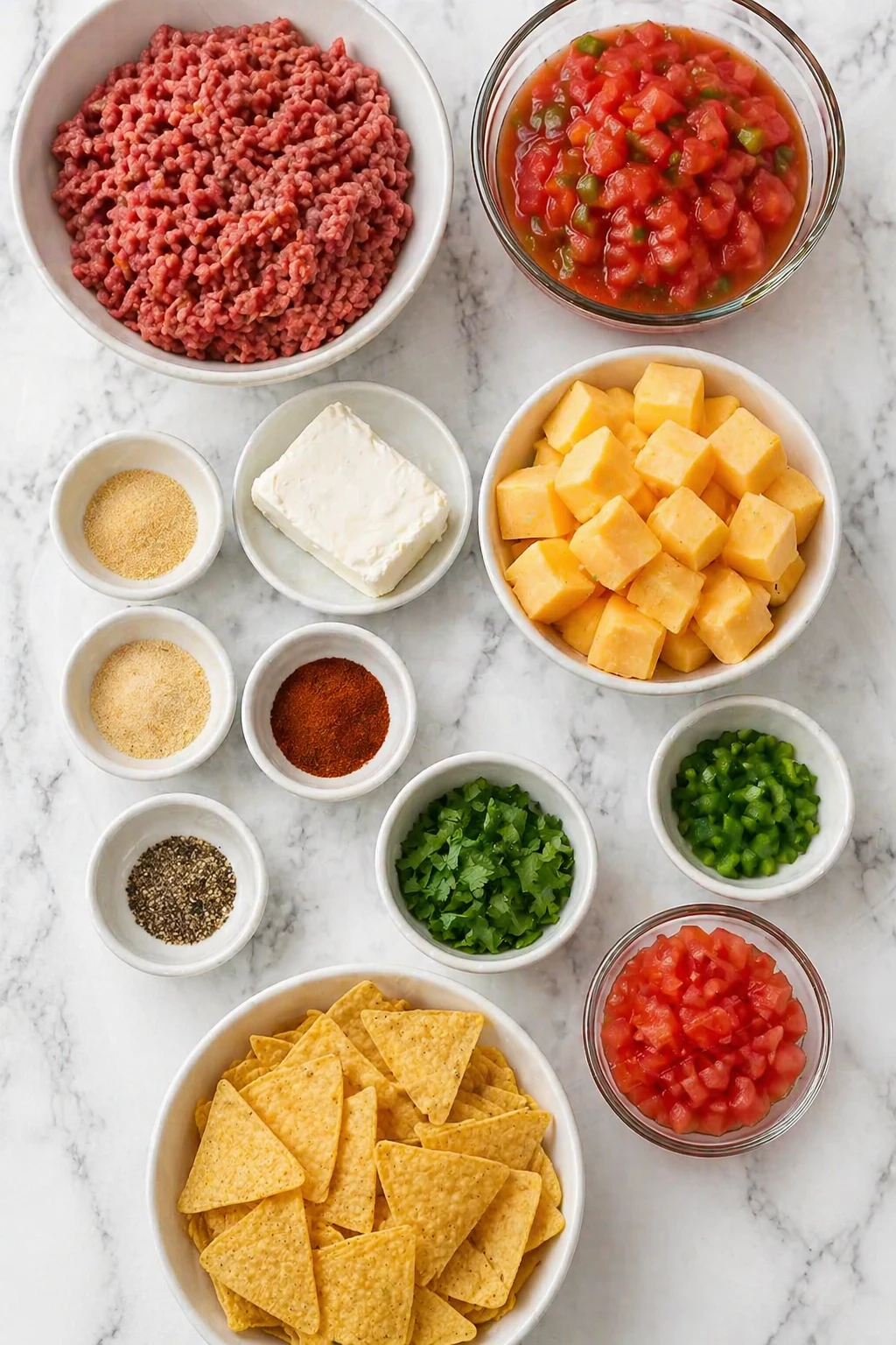 Ingredients for the Simple Rotel Dip With Ground Beef