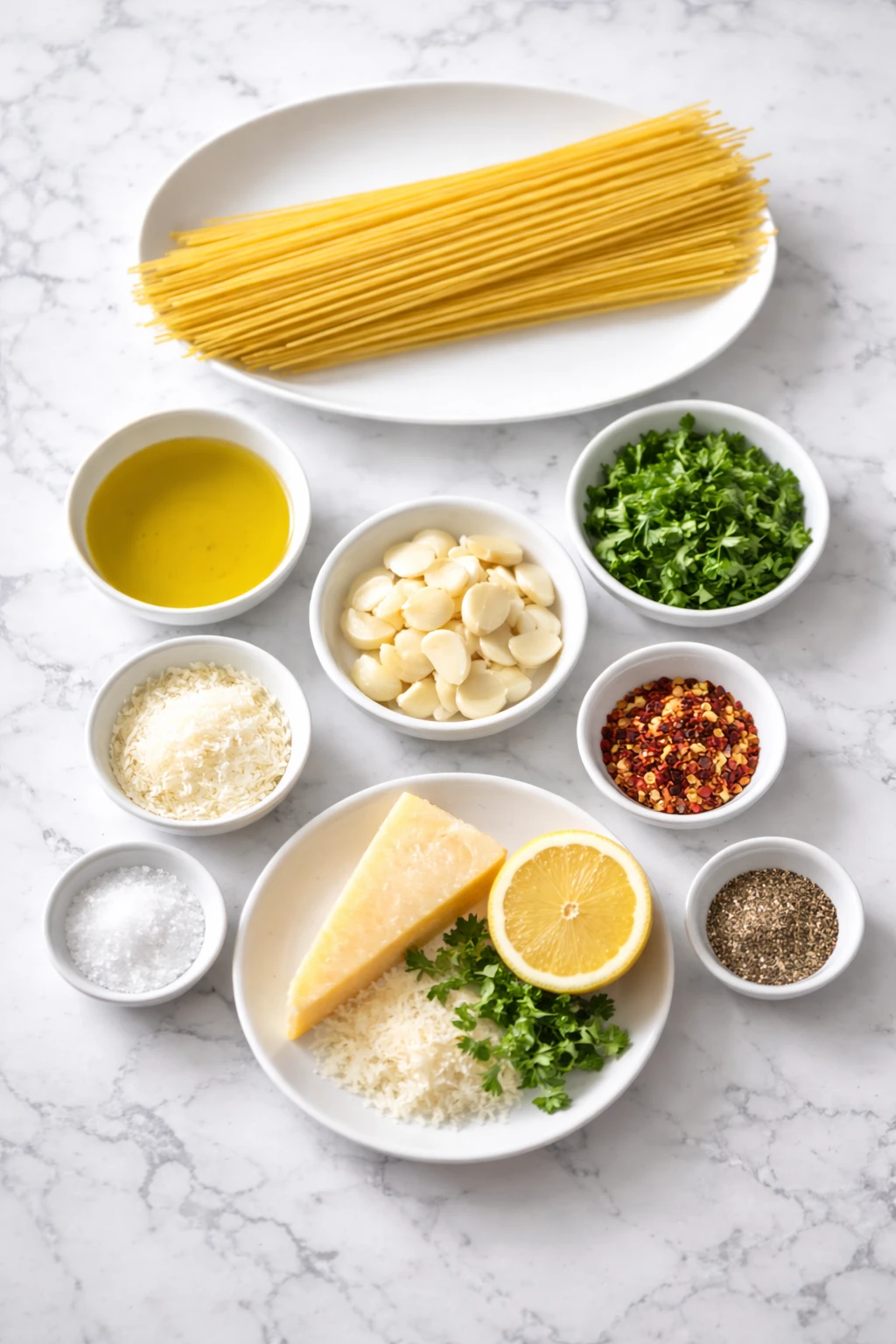 You only need a short list of ingredients to make this dish, but each one matters. Because the recipe is so simple, using fresh garlic, good olive oil, and properly cooked pasta makes a noticeable difference in the final flavor and texture.