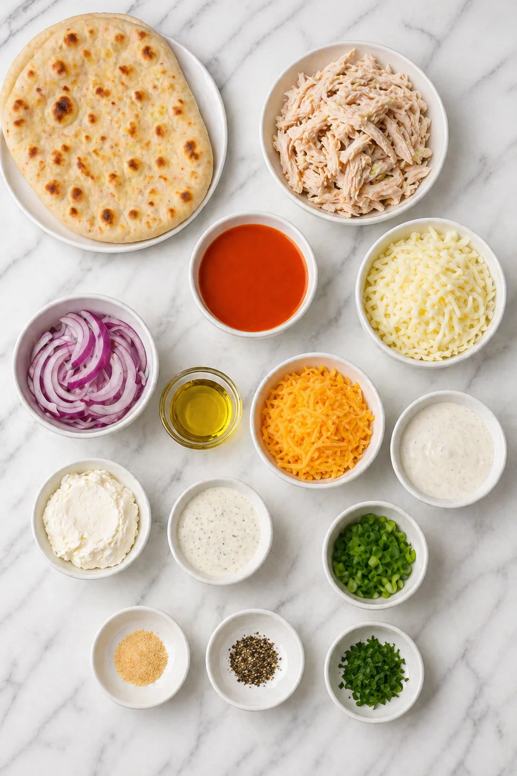 Every ingredient in this Spicy Buffalo Chicken Flatbread Pizza has a job: some build the crispy base, some create the creamy heat, and others add freshness so the finished pizza tastes balanced.