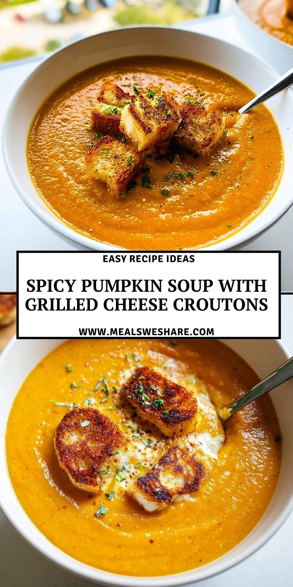 Keywords: spicy pumpkin soup, pumpkin soup with grilled cheese croutons, easy dinner, fall soup recipe, quick lunch, comfort food, holiday starter, food ideas
