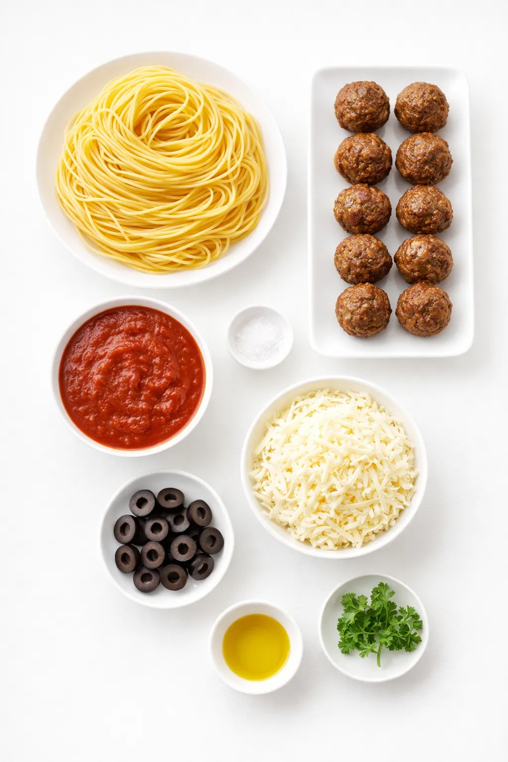 You can prep the spaghetti and meatballs ahead of time, but wait to assemble and decorate just before serving to keep the cheese looking fresh and the olives from slipping.