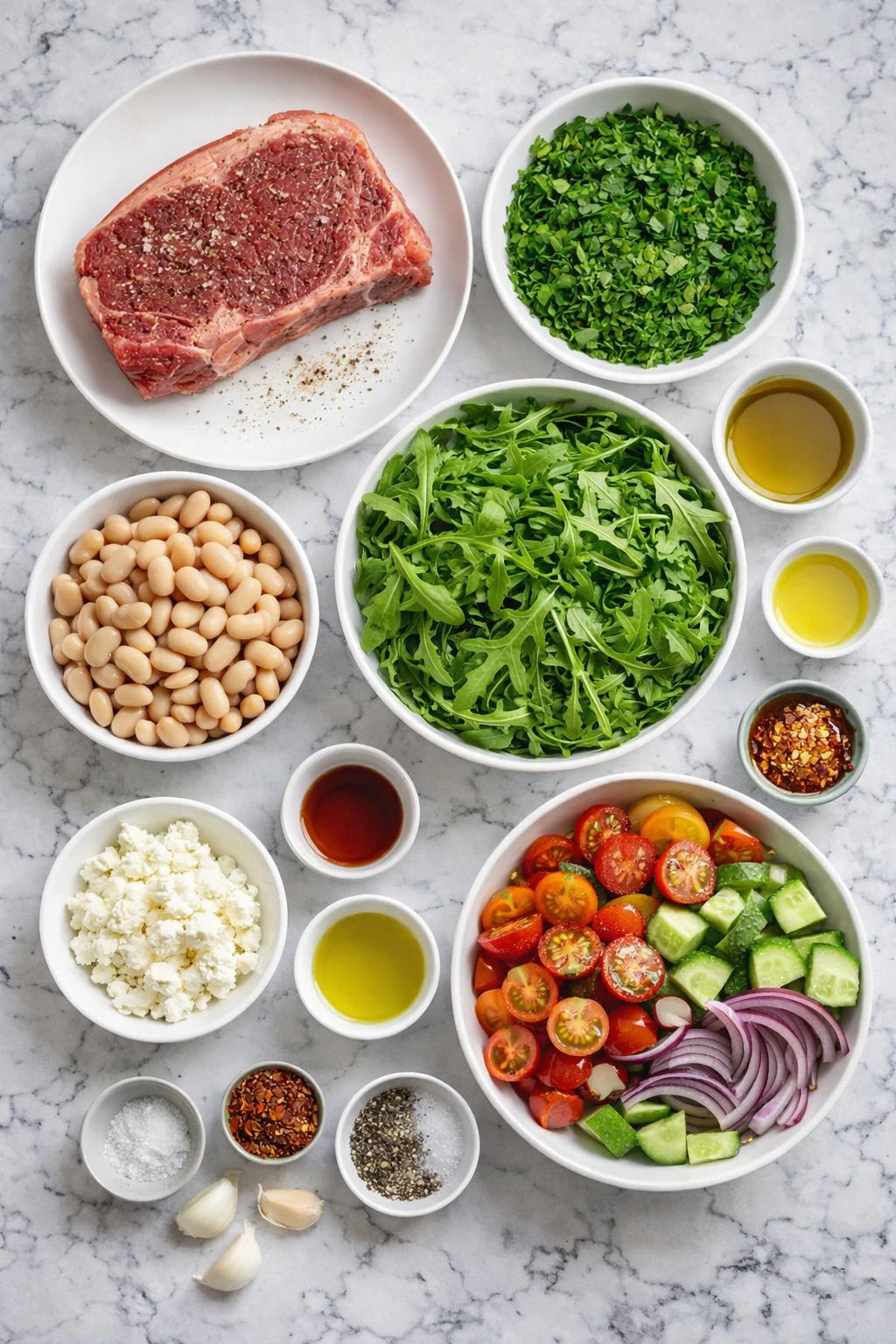 Cannellini beans give the salad its dense, creamy base. They add protein, fiber, and a soft texture that contrasts nicely with the steak and crisp vegetables.