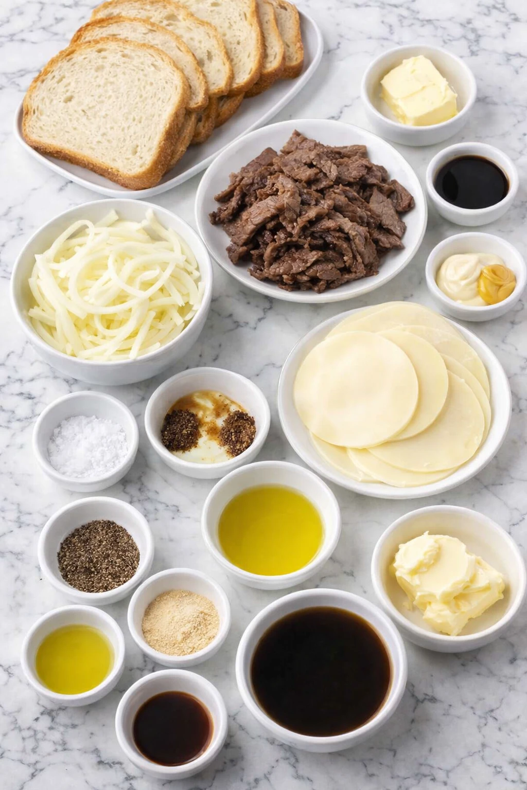 Steak – Thinly sliced sirloin or ribeye gives you rich, beefy flavor and stays tender inside the sandwich.