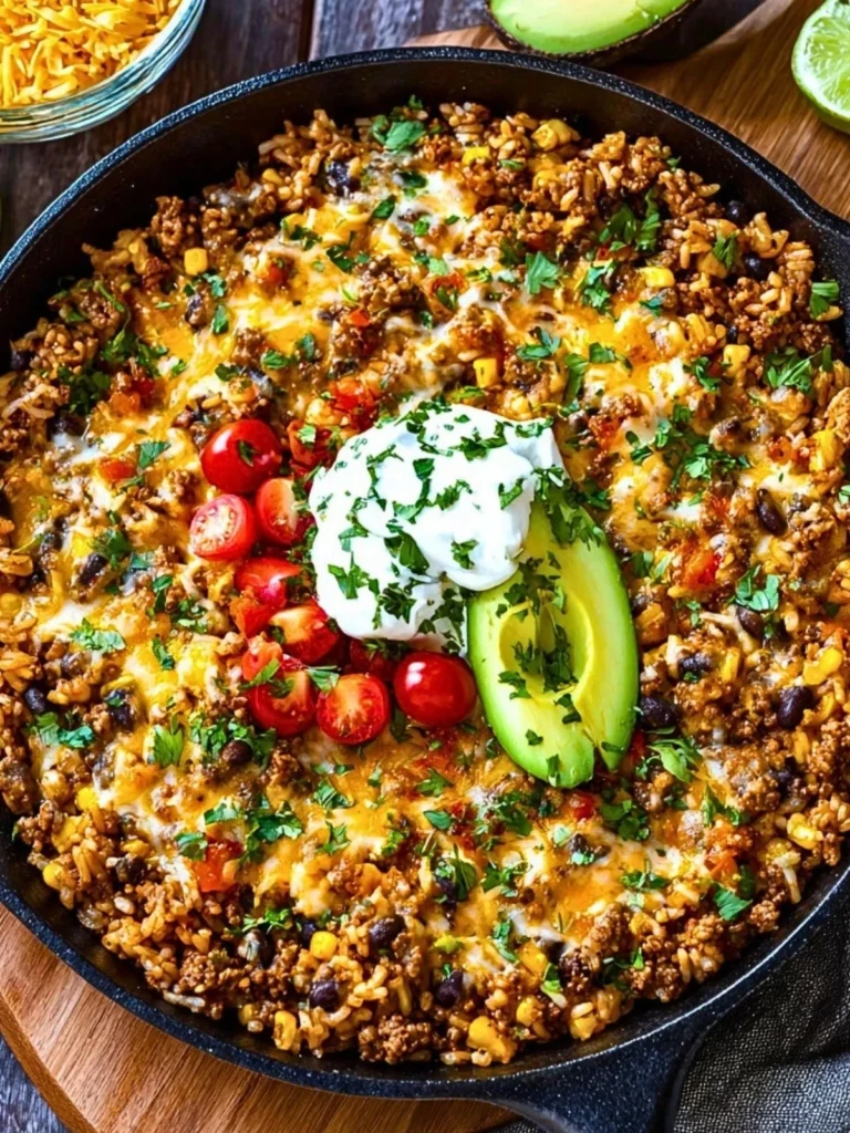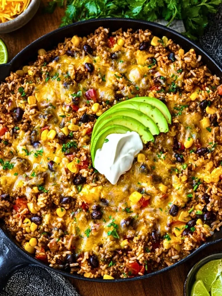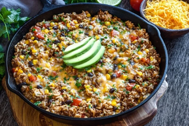 Busy nights call for quick comfort meals, and this Taco Rice Skillet is here to save the day. Packed with bold Tex-Mex flavors, it’s a one-pan wonder featuring juicy ground beef, tender rice, black beans, sweet corn, and melty cheddar cheese. It’s topped with creamy avocado slices for the perfect finish.