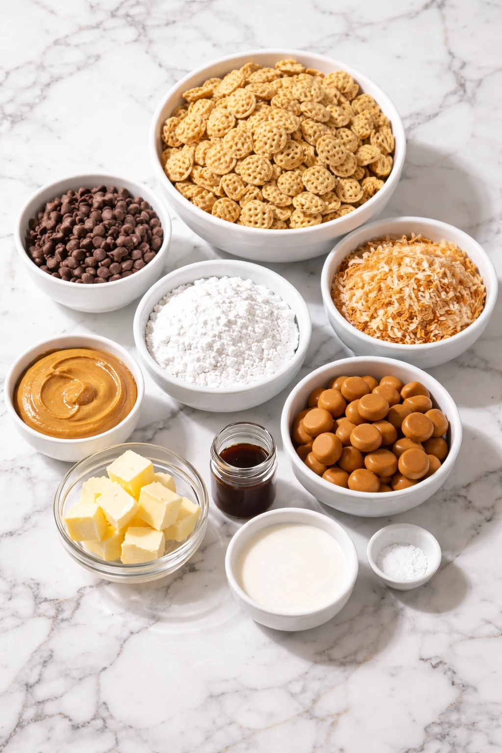 Every ingredient in this Samoas Puppy Chow has a purpose, and the mix works best when each one plays its part. Using a crisp rice or corn cereal gives the recipe its light, airy crunch and creates plenty of surface area for the coating to cling to.