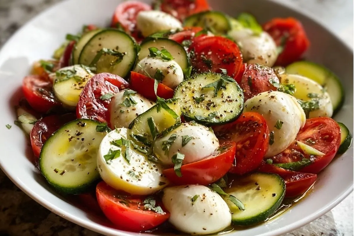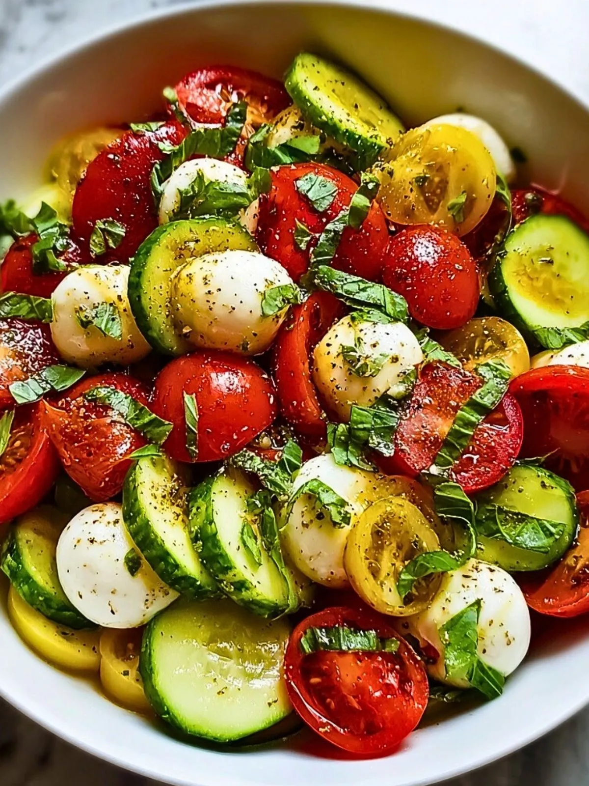 Each bite is a refreshing mix of juicy tomatoes, crunchy cucumber, and creamy mozzarella, all brought together with a drizzle of olive oil, balsamic vinegar, and a touch of seasoning. Whether you’re entertaining or just feeding your family, this is a dish that feels both wholesome and indulgent.