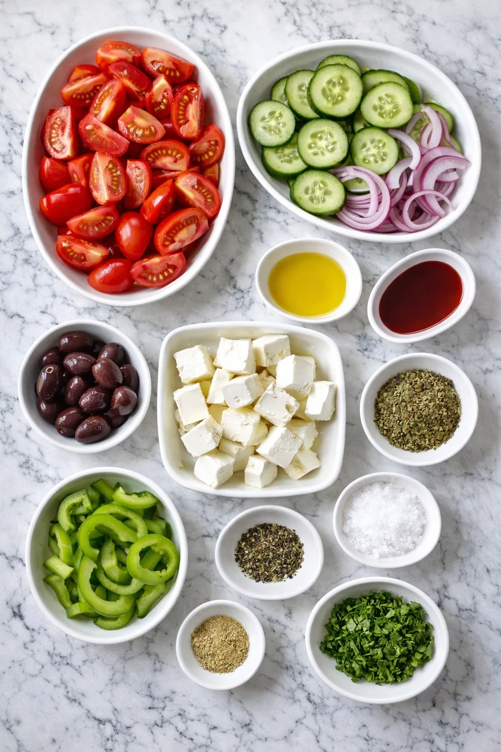 A true Greek Horiatiki Salad is defined by its simplicity and the quality of its ingredients. You won’t find lettuce or complicated dressings here—just chunky pieces of tomato, cucumber, red onion, green bell pepper, Kalamata olives, and a thick slab or cubes of feta on top. The “dressing” is nothing more than extra virgin olive oil, red wine vinegar or lemon, dried oregano, and a pinch of salt and pepper.