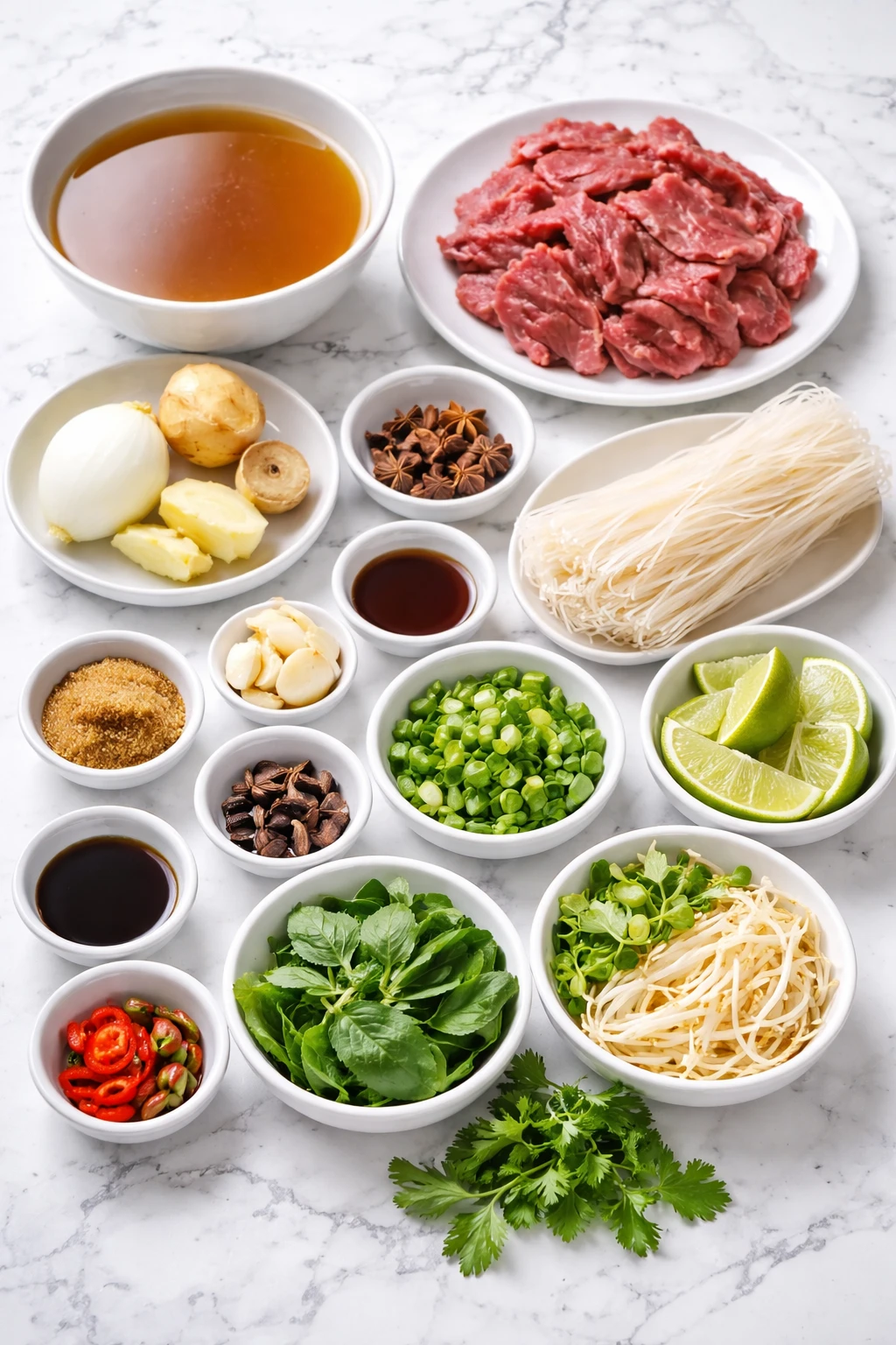 The final bowl is just as important as the broth itself. Rice noodles bring softness, thin beef adds richness, and fresh herbs with lime keep the whole dish tasting lively instead of heavy. That contrast is what makes pho so memorable.